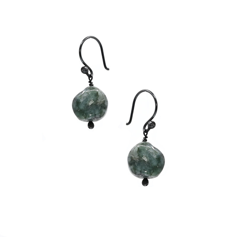 Handgjorda örhängen med krokar av oxiderat sterling silver 925. Örhängena pryds av rå smaragder.